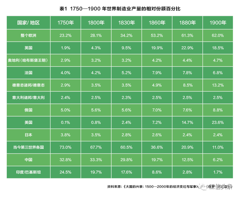自18世紀末開始,在工業革命和工業化浪潮的影響下,國際力量對比逐漸變得不利于舊有的一流強國,而有利于那些既有資源又善于組織利用新生產工具和新技術的國家。工業革命的發源地——英國率先轉型成功。英國經濟在1800 年以前已呈蒸蒸日上之勢;到 19 世紀下半葉,西歐多國也取得了類似英國的長足進步。殖民優勢帶來的資本原始積累和世界市場的成功開拓,將工業革命點燃的歐洲轉型之火燒得更旺,歐洲成為歷史上制造業“覺醒”的最早一極,在 19 世紀中葉確立了全球優勢。