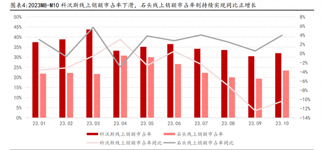 科沃斯主推高端致使市占率承壓,石頭科技高性價(jià)比新品助力市場(chǎng)份額提升。受消費(fèi)者更青睞性價(jià)比款掃地機(jī)新品的影響,本輪主推高端新品 X2 系列的科沃斯市占率持續(xù)承壓,而石頭科技則憑借性價(jià)比進(jìn)一步提升的新品 P10 Pro 實(shí)現(xiàn)市場(chǎng)份額快速提升。根據(jù)奧維云網(wǎng)數(shù)據(jù),2023M8-M10 科沃斯線上銷額和銷量市占率同比均下滑超 7pct,2023M10 單月銷額、銷量市占率分別達(dá) 32.00%(- 10.38pct)、29.27%(-8.94pct);石頭科技 2023M8-M10 銷額和銷量市占率則持續(xù)實(shí)現(xiàn)同比正增長(zhǎng),2023M10 單月銷額、銷量市占率分別達(dá) 23.39%(+3.98 pct)、20.75%(+4.63pct)。