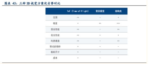3D 視覺技術較多,主要有 ToF (Time-of-Flight)、雙(多)目視覺、結構光等。目前人形機 器人主要采用的方案是多目視覺、TOF。1) ToF 可用于測量距離以獲得深度數據。集成在相機中的光源可發出光脈沖照射到物體上,物體將光脈沖反射回相機。根據光脈沖所需的時間,可以確定被測物每個點與相機的距離信息,從而得到深度值。與其他 3D 相機相比,ToF 相機更為經濟、精巧和簡單,可實現輕松安裝和集成。不過,ToF 相機僅在特定環境條件下和定義的測量范圍內,才能提供理想 的采集結果。2)雙(多)目視覺的工作原理與人眼類似。其 3D 原理是使用兩(多)臺 2D 相機從不同視角 拍攝同步的圖像,從而獲得深度信息。為了計算3D數據,必須知道兩(多)臺相機之間的相對位置(外部參數),然后使用適配算法在左右圖像中搜索相應的像素,最后借助校準值,就可以將場景或物體的深度圖像生成為點云。對于結構簡單的表面,由于雙目視覺方法在兩個圖像中拍攝到的相應特征不足,因此無法從中計算出三維信息。3) 與雙目視覺技術不同,結構光技術需要將其中一臺相機替換為條紋光投影儀。它會投影具有正弦強度曲線的各種條紋狀圖案,從而在表面上創建系統已知的人造結構。在表面上投影的條紋變形可用于計算3D信息,并獲得更準確的測量結果。具備結構光功能的芯片在近距離內可實現較高的精度。使用結構光方法時會產生很高的計算負載,它需要逐張采集和分析多個圖像,不適用于移動的物體。