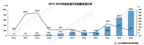 2023年,新能源汽車產銷累計完成958.7萬輛和949.5萬輛,同比分別增長35.8%和37.9%,市場占有率達到31.6%。在新能源汽車主要品種中,與上一年度相比,三大類新能源汽車品種產銷均呈明顯增長。