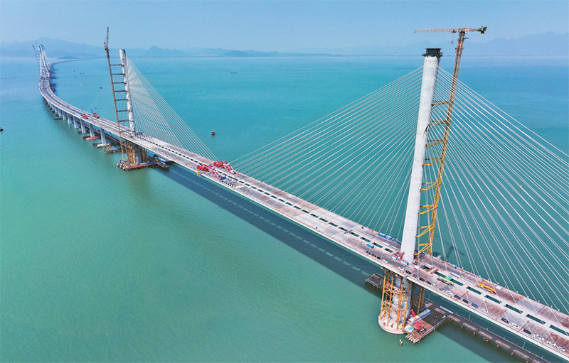 黃茅海跨海通道是粵港澳大灣區又一超大型跨海工程,跨海段由高欄港大橋和黃茅海大橋兩座主橋組成,項目建成后將進一步完善大灣區跨海跨江通道群,助力高質量發展。圖為2024年3月20日,黃茅海跨海通道高欄港大橋合龍梁段。 新華社記者 劉大偉/攝