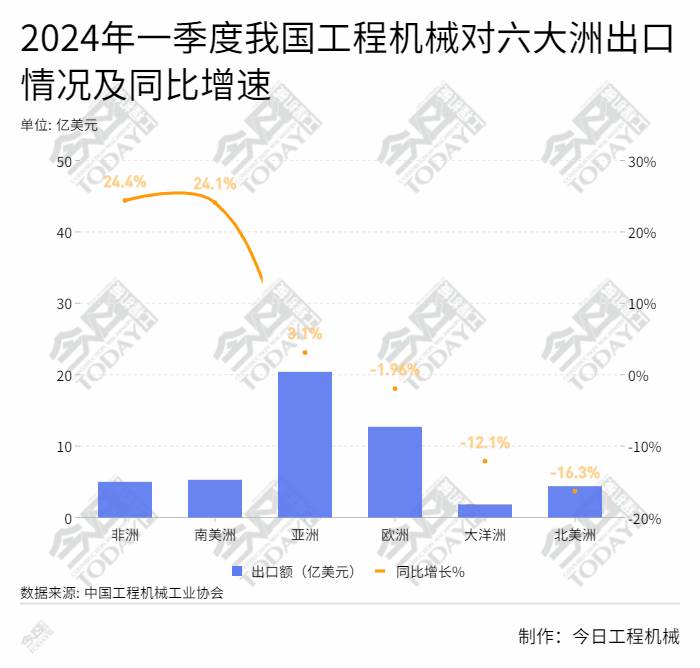 出口方面,累計出口整機85.58億美元,同比增長4.98%,占出口總額的71.3%;零部件出口34.49億美元,同比下降2.86%,占出口總額的28.7%。2024年一季度出口額增加的主要有:電動叉車及升降平臺、內燃叉車及升降平臺、非公路礦用自卸車、隧道掘進機、其他起重機、最大起重量100噸以上全路面起重機、混凝土攪拌車、其他工程車輛、混凝土泵車等。出口額減少的主要有:履帶挖掘機、零部件、壓路機、筑路機及平地機等。