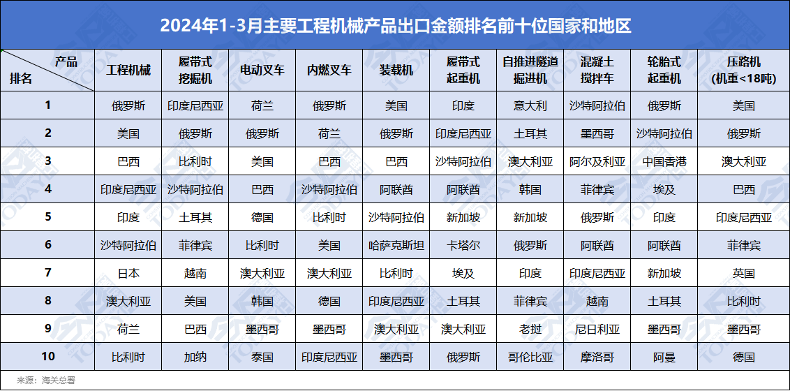進口方面,2024年1-3月,零部件進口3.69億美元,同比下降15.8%,占進口總額的56.5%。進口整機2.85億美元,同比增長49.1%,占進口總額的43.5%。進口增長的主要有:非公路礦用自卸車、其他起重機、320馬力以上推土機、打樁機及工程鉆機、裝載機等。進口下降主要有:零部件、電動叉車及升降平臺、鑿巖機械和風動工具、混凝土攪拌機械等。