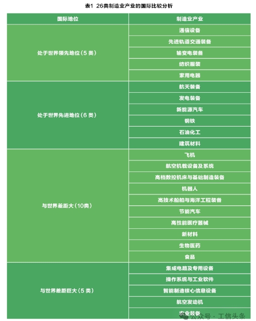 2019 年,中國工程院出具了一份報告,報告對中國 26 類具有代表性的制造業產業進行了國際比較分析,結果如下。
