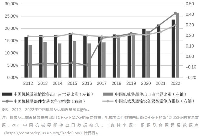 2009年,中國超過德國成為機械及運輸設備出口第一大國,其后國際市場占有率持續提高,2022年達到23.66%。與此同時,中國機械零部件的國際市場占有率也在不斷提高,從2012年的13.34%上升到2022年的26.40%。中國裝備制造業在全球價值鏈中長期處于進口大量零部件組裝出口的分工位置,然而從2018年開始,這一分工地位出現了明顯變化,不僅機械零部件國際市場占有率后來居上超過機械及運輸設備國際市場占有率,而且機械零部件貿易競爭力指數也開始超過機械及運輸設備貿易競爭力指數,2022年達到0.4113(見圖3)。這一現象表明中國裝備制造業在全球價值鏈中所處的分工地位向更高附加值的中間品環節遷移,全球分工地位進一步提升。