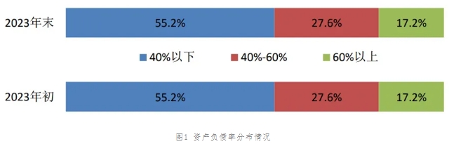 資產負債率超過70%的,年初為3家,年末有5家,無超過100%的情況,資產負債率分布情況見圖1。