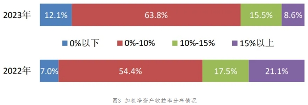 2023年,加權平均凈資產收益率除一家因上年同期的加權平均凈資產出現負數導致不適用外,剩下的57家中,有18家同比增長,占31.6%;39家同比下降,占68.4%。加權平均凈資產收益率分布情況見圖3。與上年相比,加權平均凈資產收益率0%以下的企業數占比上升5.1個百分點;0%-10%占比上升9.4個百分點;10%-15%占比下降2.0個百分點;15%以上占比下降12.4個百分點。