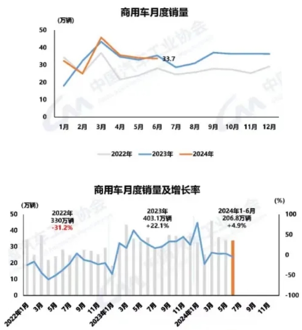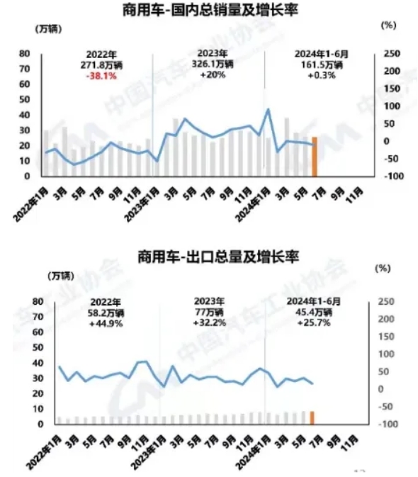 6月,商用車國內銷量25.5萬輛,環比下降0.8%,同比下降10.3%;商用車出口8.2萬輛,環比下降2.5%,同比增長16.9%。1-6月,商用車國內銷量161.5萬輛,同比增長0.3%;商用車出口45.4萬輛,同比增長25.7%。