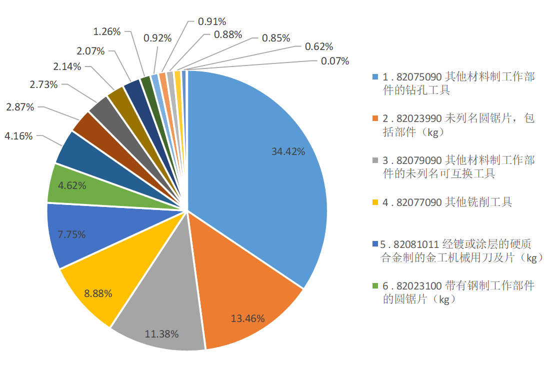 2024年上半年刀具出口的主要品種及金額分別是:鉆頭(42.65億元)、圓鋸片(22.41億元)、刀片(14.29億元)、互換工具(14.1億元)、銑刀(11億元)、攻絲工具(5.16億元)、超硬孔加工刀具(3.38億元)、超硬互換工具(2.65億元)、雙金屬帶鋸條(2.56億元)。