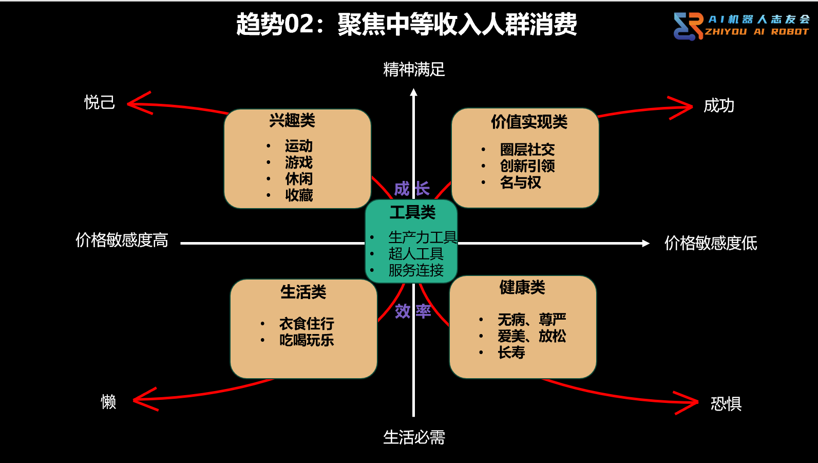 外部環境和經濟變化很快,但中等收入以上階層想成為更好的自己,對美好生活向往不變。他們更懶、更恐懼、更悅己、更渴望成功。而機器人可以在不遠的將來做人不愿意做的事情,讓人精致懶;機器人可以輔助預測安全,降低疾病和危害;機器人可以成為伙伴,調劑情緒價值;機器人可以成為工具輔助成長和提高效率,實現個人價值。