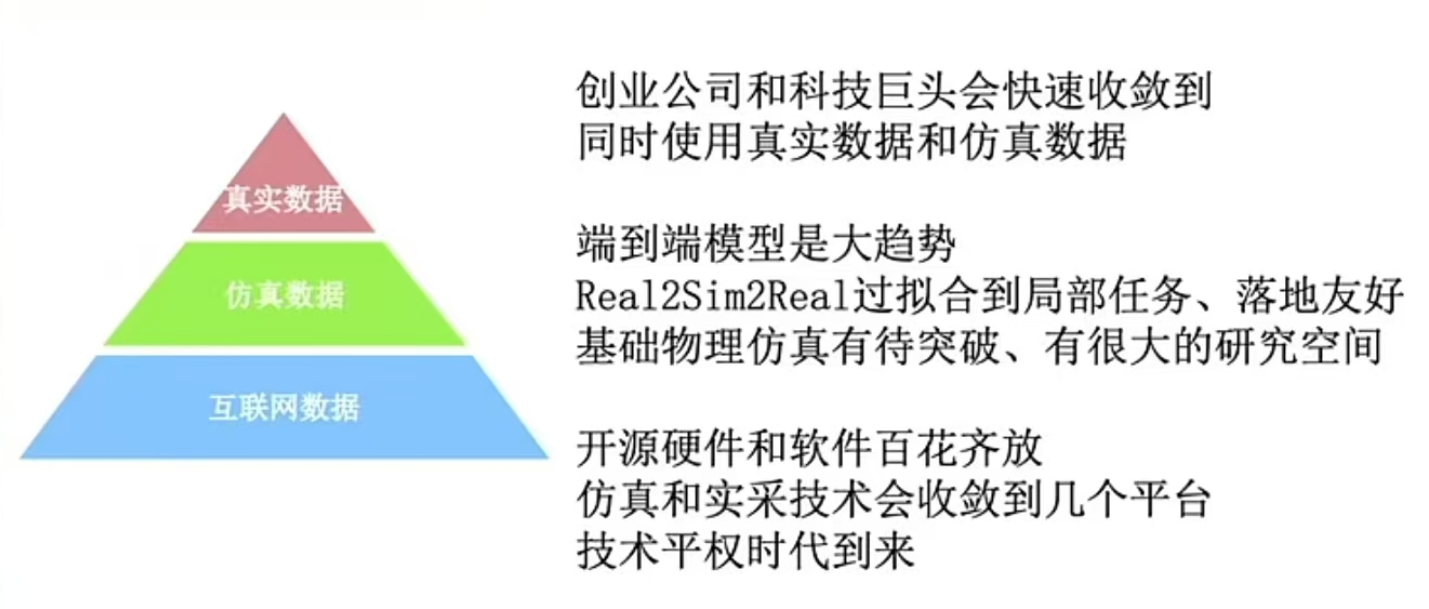 4)技術逐漸收斂,仿真+深度學習+模仿學習成為主流,數據從互聯網到仿真生成再到真實采集結合,各企業差異并不是很大。全國最起碼上百個公司在做人形機器人,接下來2-3年的沉寂期,拼的則是誰的血厚,能熬。