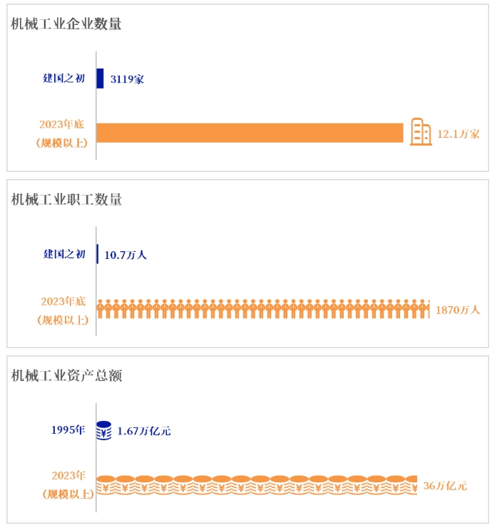 新中國成立之初,機械工業企業數量為3119家,此后數量持續增加,多種所有制經濟共同發展。截至2023年末,機械工業規模以上企業(主營業務收入2000萬元以上)數量已達到12.1萬家,約占全國工業規模以上企業數量的四分之一。職工人數由1949年的10.7萬人,增至2023年規模以上企業從業人員約1870萬人,累計增長174.8倍,占全國工業職工人數的24.1%。資產總額由1995年有記錄以來的1.67萬億元,提高至2023年的36萬億元,累計增長21.6倍,年均增長11.6%。