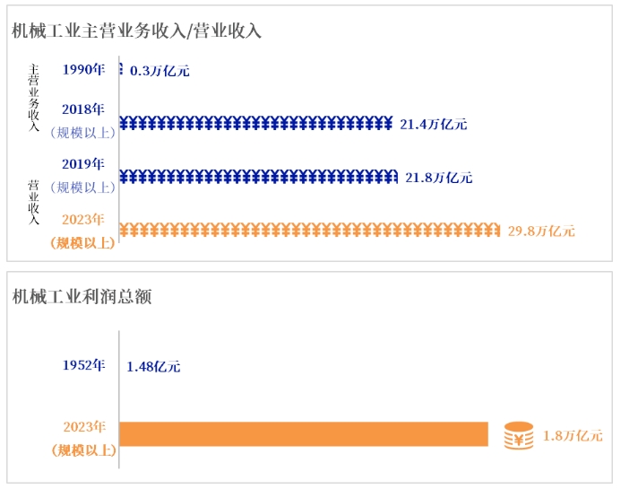 機械工業年度主營業務收入由1990年的3379.2億元,增至2023年實現營業收入29.8萬億元,占全國工業的22.3%。年度實現利潤總額,由1952年機械系統企業的1.48億元,增至2023年規模以上企業合計的1.8萬億元,占全國工業的22.8%。