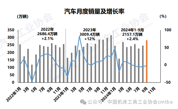 9月,汽車產(chǎn)銷分別完成279.6萬(wàn)輛和280.9萬(wàn)輛,環(huán)比分別增長(zhǎng)12.2%和14.5%,同比分別下降1.9%和1.7%。1-9月,汽車產(chǎn)銷累計(jì)完成2147萬(wàn)輛和2157.1萬(wàn)輛,同比分別增長(zhǎng)1.9%和2.4%。