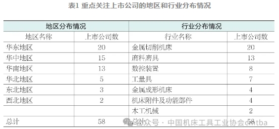 2024上半年中國(guó)機(jī)床工具工業(yè)協(xié)會(huì)重點(diǎn)關(guān)注的上市公司,較2023年新增一家(301603喬鋒智能),減少一家(600243青海華鼎),總數(shù)仍為58家,其中深交所主板23家,創(chuàng)業(yè)板22家;上交所主板4家,科創(chuàng)板9家。協(xié)會(huì)重點(diǎn)關(guān)注上市公司的具體地區(qū)和行業(yè)分布情況見表1。