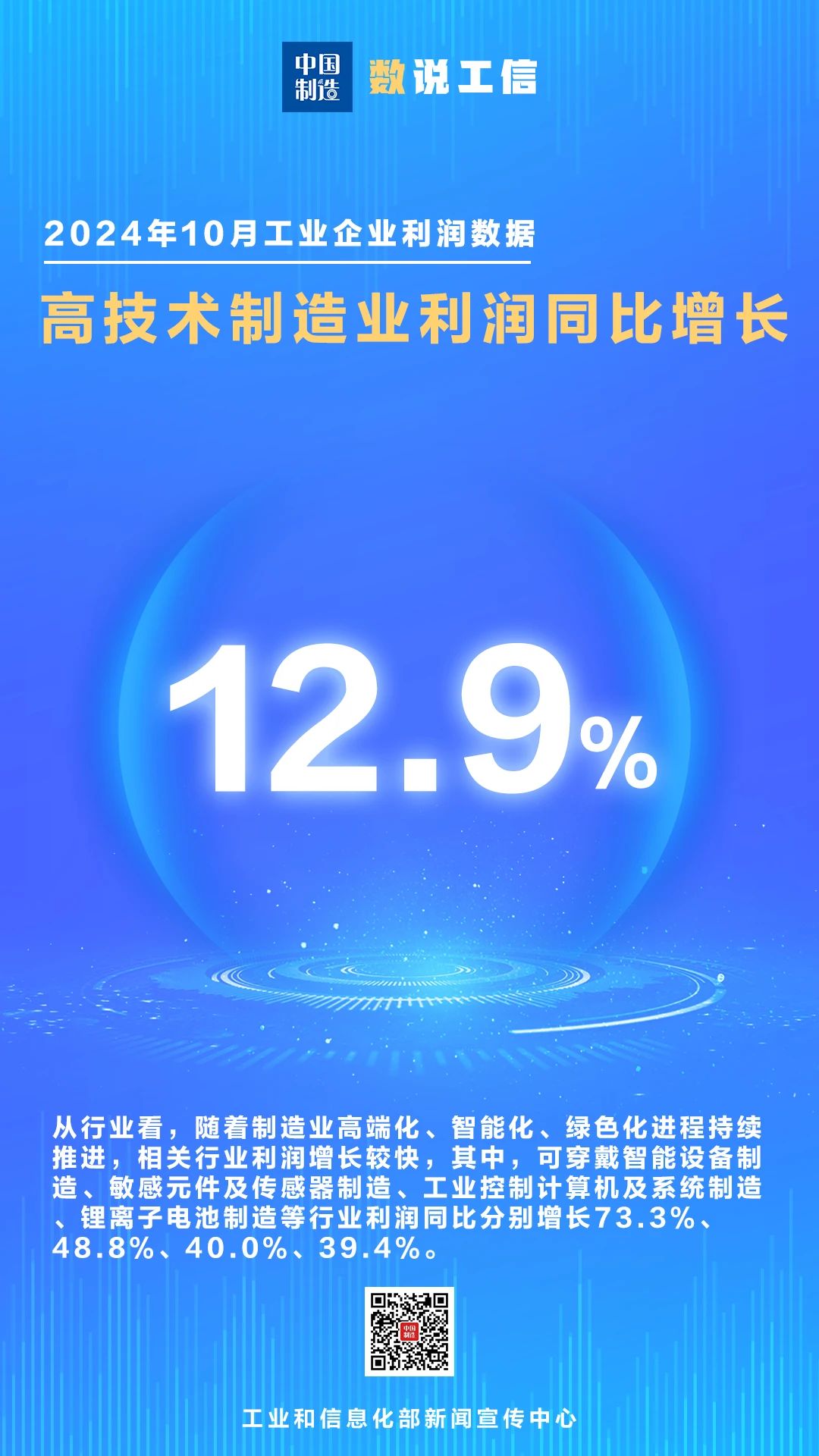 高技術制造業利潤兩位數增長。10月份,高技術制造業利潤同比增長12.9%,大幅高于規上工業平均水平22.9個百分點,拉動規上工業利潤增長1.9個百分點,支撐和引領作用明顯。從行業看,隨著制造業高端化、智能化、綠色化進程持續推進,相關行業利潤增長較快,其中,可穿戴智能設備制造、敏感元件及傳感器制造、工業控制計算機及系統制造、鋰離子電池制造等行業利潤同比分別增長73.3%、48.8%、40.0%、39.4%。
