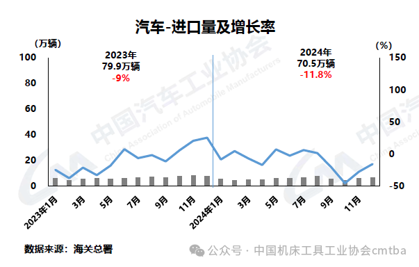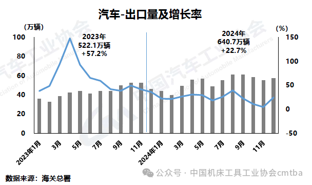 2024年,汽車進口70.5萬輛,同比下降11.8%;出口640.7萬輛,同比增長22.7%。