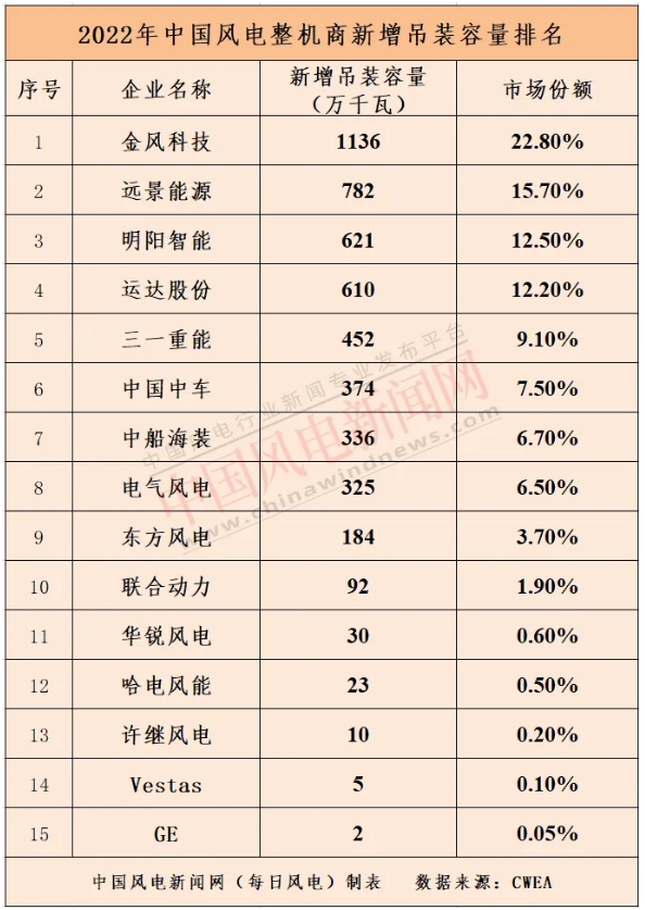 2024年,中國風電市場有新增裝機的整機制造企業共13家,新增裝機容量8699萬千比,前5家市場份額合計為75%,前10家市場份額合計為98.6%。其中:金風科技以1867萬千瓦新增裝機位居第一,占比21.5%;遠景能源1363萬千瓦位居第二,占比15.7%;明陽1229萬千瓦位居第三,占比14.1%。