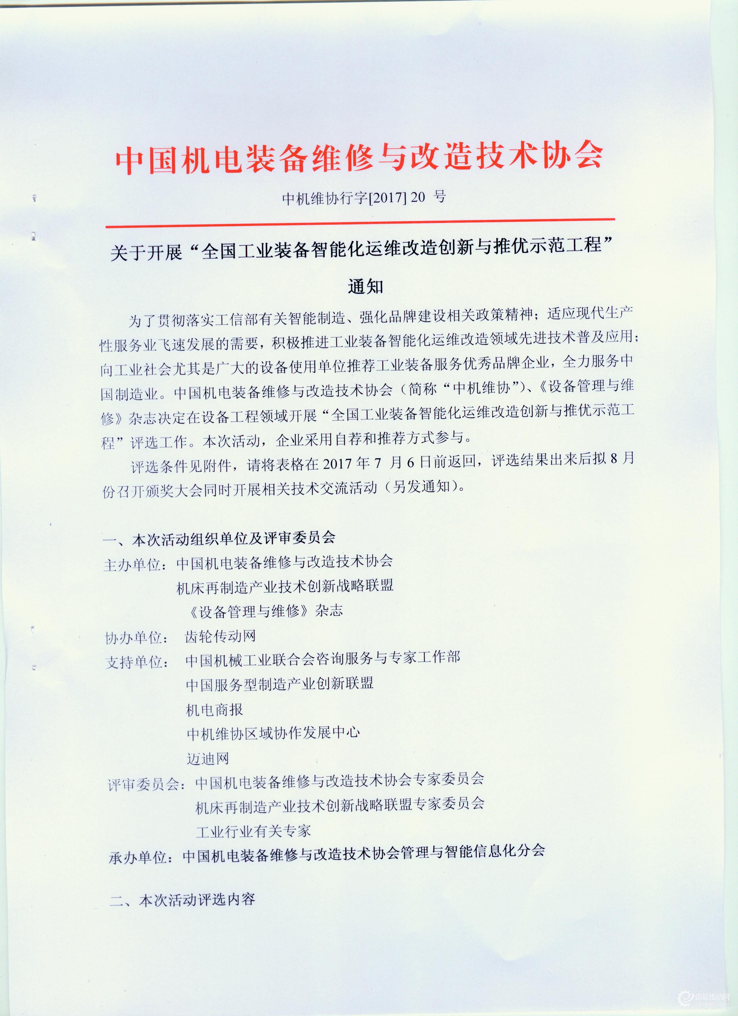 為了貫徹落實(shí)工信部有關(guān)智能制造、強(qiáng)化品牌建設(shè)相關(guān)政策精神;適應(yīng)現(xiàn)代生產(chǎn)性服務(wù)煊飛速發(fā)展的需要,積極推進(jìn)工業(yè)裝備智能化運(yùn)維改造領(lǐng)域先進(jìn)技術(shù)普及應(yīng)用;向工業(yè)社會(huì)尤其是廣大的設(shè)備使用單位推薦工業(yè)裝備服務(wù)優(yōu)秀品牌企業(yè),全力服務(wù)中國制造業(yè)。中國機(jī)電裝備維修與改造技術(shù)協(xié)會(huì)(簡稱“中機(jī)維協(xié)”)決定在設(shè)備工程領(lǐng)域開展“全國工業(yè)裝備智能化運(yùn)維改造創(chuàng)新與推優(yōu)示范工程”評(píng)選工作。本次活動(dòng),企業(yè)采用自薦和推薦方式參與。