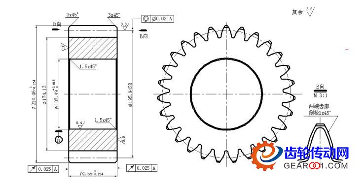 以美國TEREX TR100驅(qū)動橋輪邊減速器一級行星輪的原廠圖紙為例,詳見圖1所示(出于保密,對原圖和超精加工無關(guān)部分進(jìn)行多處刪改)。