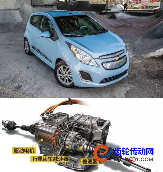 雪佛蘭SPARK EV車型使用行星齒輪組作為減速器,可以將很高的電動機轉速降到車輪轉動的轉速,同時可以放大扭矩,而差速器為一般的冠狀齒輪架構